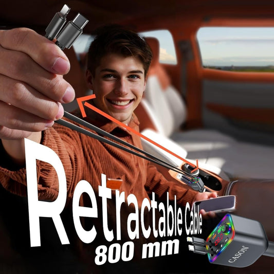 Cason Car Charger 120W Type-C Fast Charging with Bluetooth FM Transmitter- 4-in-1 Retractable Car Mobile Charger Cable with 2 USB Port, with LED Display for iPhone, Android Smartphone (Retractable)