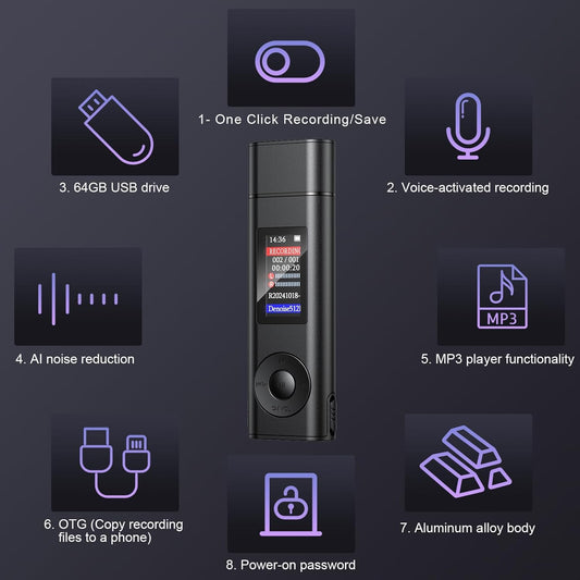 Cason 32GB Voice Recorder Device with AI Noise Reduction & Mp3 Player with Earphones,Audio Recording Device/Voice Recorder Mic Upto 50 Hours for Meetings/Lectures(Black)