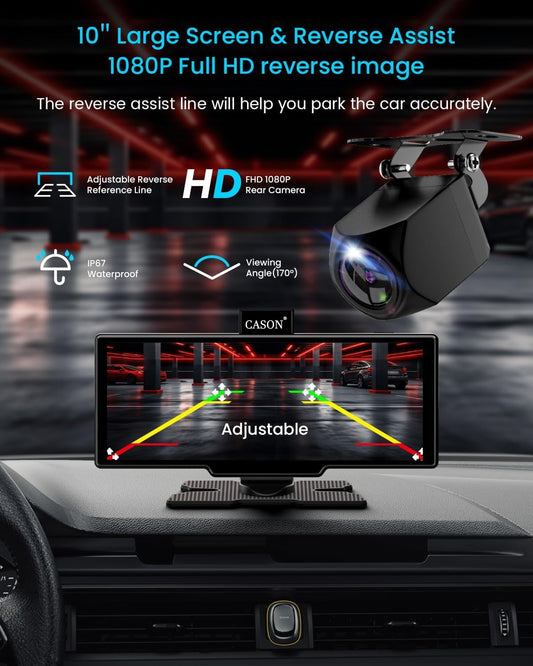 Cason 4k Dash Camera for Car with Carplay/Android System Touch Screen 10-Inch &1080P Rear Camera,Car Dash Camera Front and Rear with GPS, with Voice Control,Bluetooth for All Vehicles