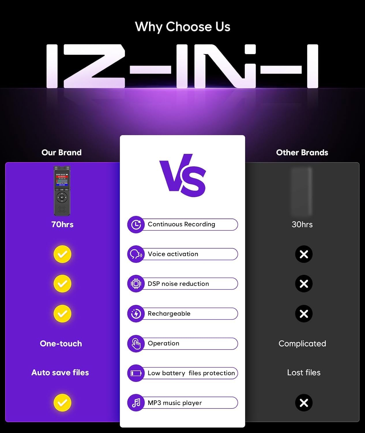 - Ample Storage and Long Battery Life: This audio recording device comes with a 32GB external TF card (expandable up to 128GB), allowing you to store up to 570 hours of recording (128Kbps) or 5,000 songs. The built-in rechargeable battery offers up to 50 hours of continuous recording or playback with earphones. Plus, the voice recorder mic ensures high-quality audio capture, and when the battery is low, your recordings are automatically saved and the device shuts down to preserve data.