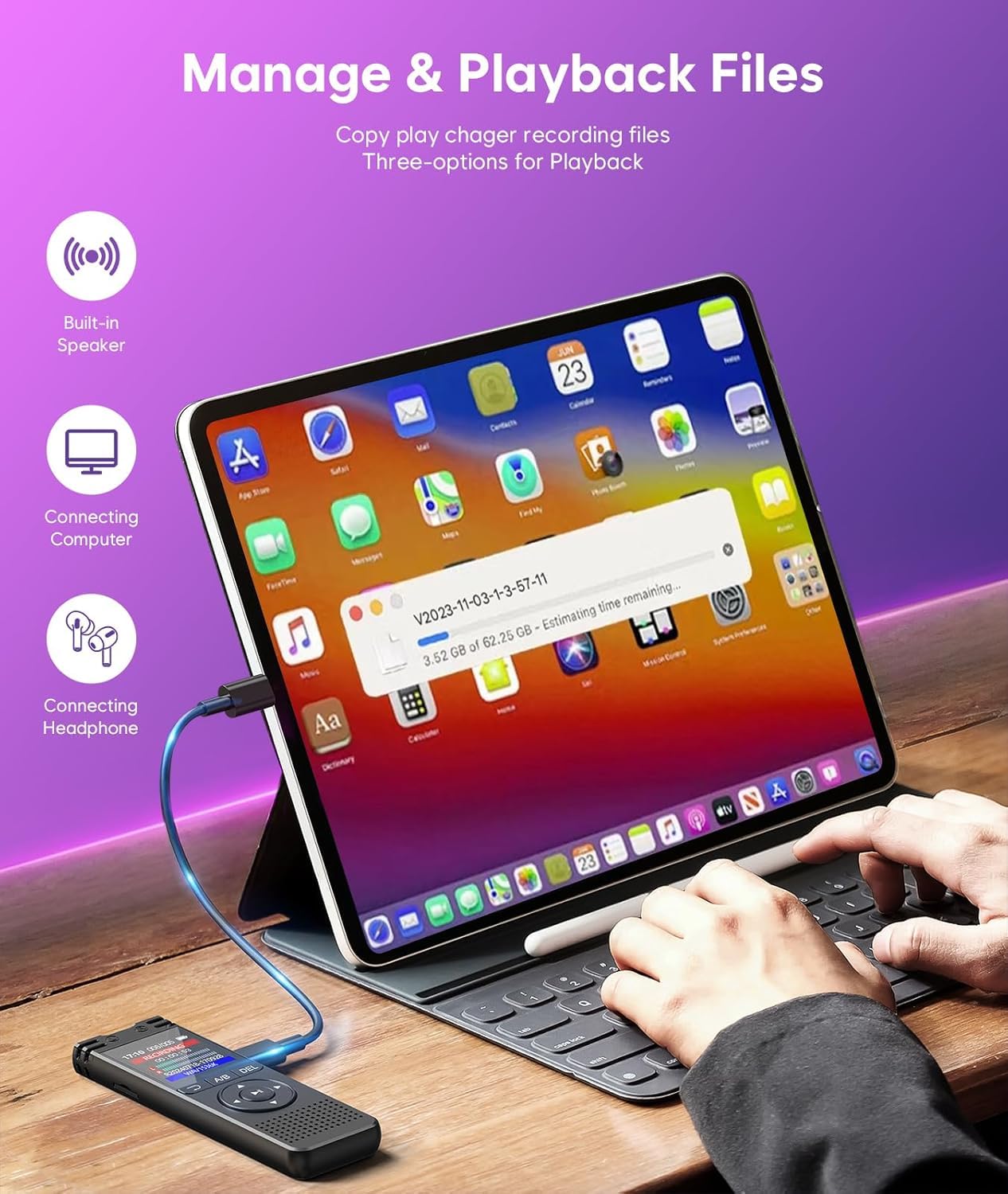 - AI-Intelligent Noise Reduction: This advanced voice recorder device is equipped with triple intelligent digital noise reduction technology and an AI 4.0 chip. It automatically detects and optimizes environmental sounds, enhancing human voices for crystal-clear recordings—perfect for office meetings, lectures, and study sessions.