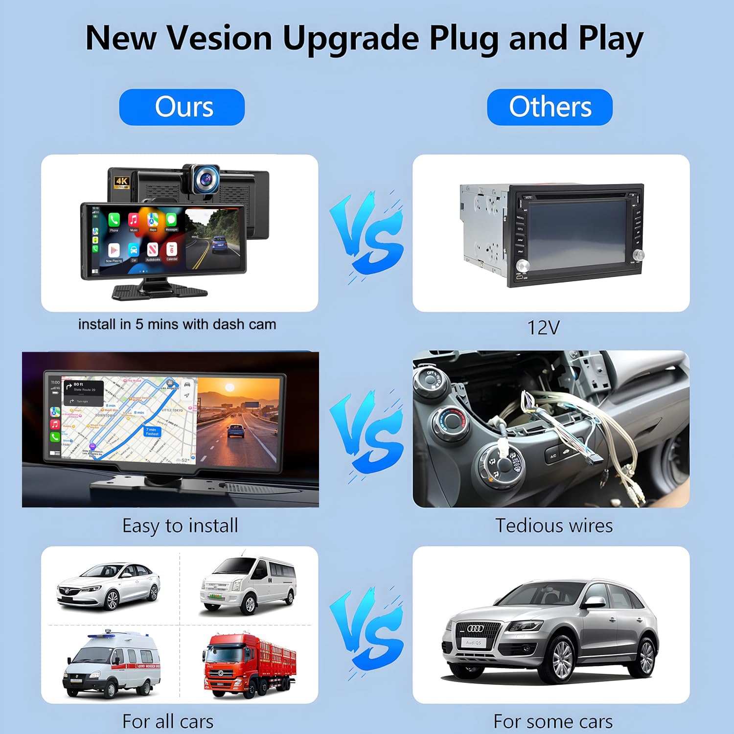 - 4K Advanced Dashcam with Seamless Wifi Connectivity-Our car display screen prioritizes safety and convenience with an integrated 4k dash camera for car. Capture high-resolution footage of the road ahead and your surroundings with the car dash camera front. The wireless portable car android player allows for easy Wi-Fi connectivity, enabling instant downloading and sharing of footage to your smartphone.