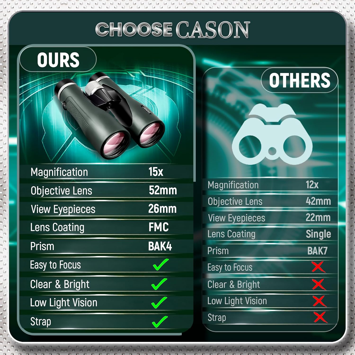Cason ED Glass- 15 X 52 Binoculars for Long Distance,Binoculars for Bird Watching,Wildlife with Phone Adapter | Mettalic Knobs | Nitrogen Filled | Range 3000 Meter | BAK 4 Glass (Green)