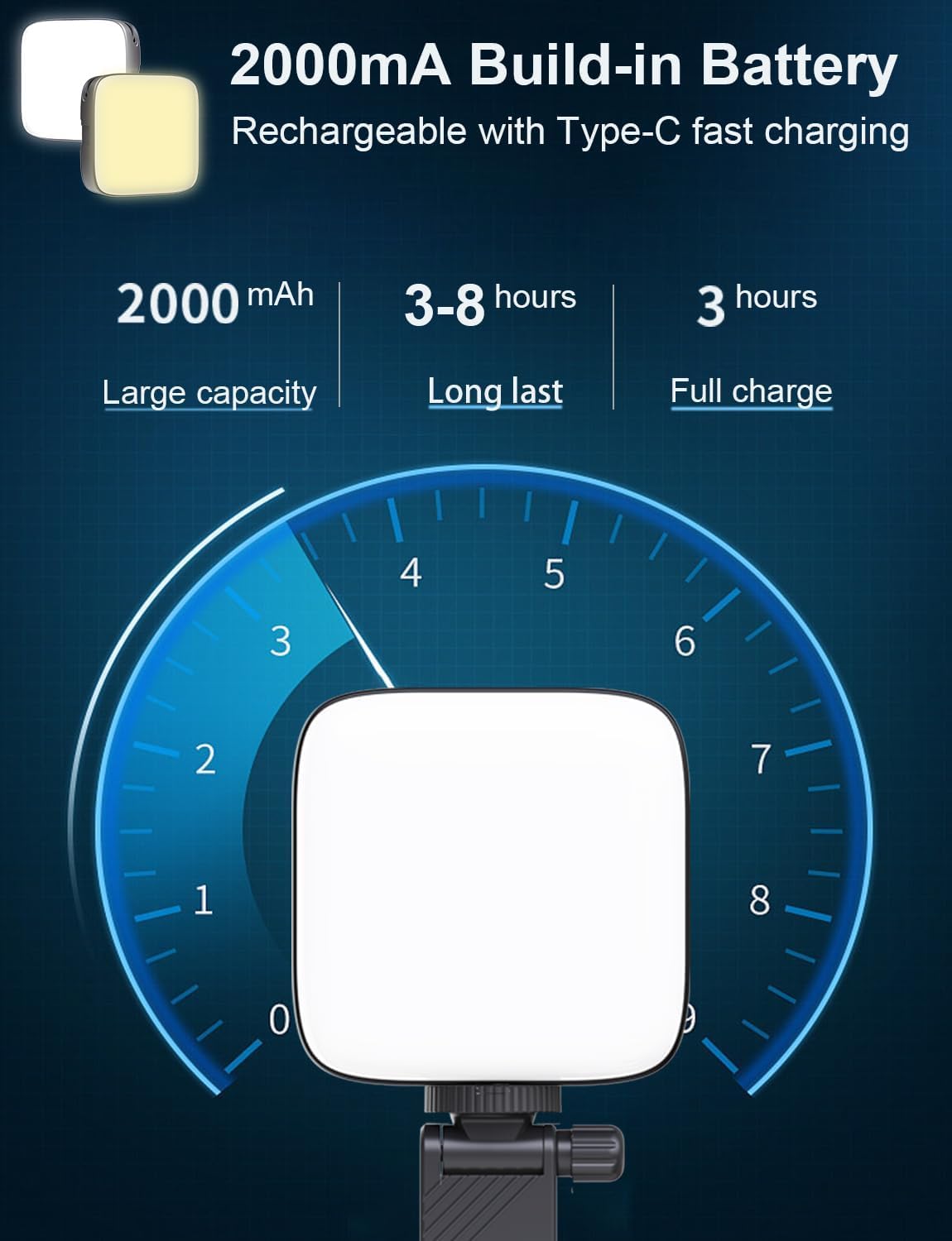 - [Built-in 2000mAh Rechargeble Battery] Laptop Light for Video Conferences can be charged by most devices that support USB ports or Type-C ports. With its built-in high-capacity rechargeable battery, selfie light can be easily fully charged in 3 hours, and can operate for 3-8 hours all the time. With an extended battery life, you can enjoy the joy of taking selfies anytime and anywhere without worrying about running out of power.
