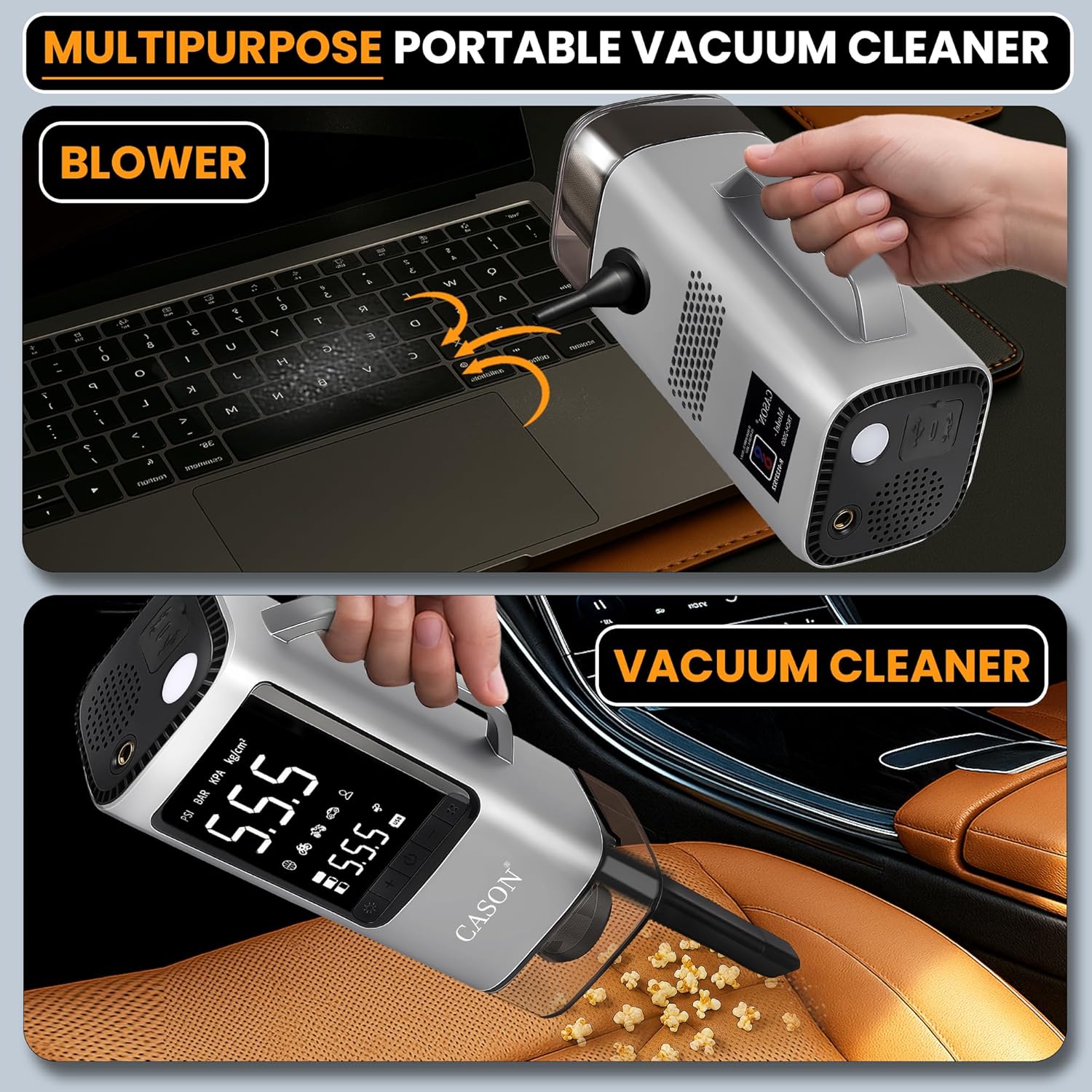 - Powerful 3-in-1: Tire Inflator + Vacuum Cleaner + Jump Starter - This all-in-one device combines tire inflation, car vacuuming, and emergency jump-starting in a single unit. With a 150 PSI compressor for rapid inflation of car tires, pool floats, and air mattresses, 8000PA suction to keep your car interior clean, and a 3000A peak current for quickly jump-starting most 12V vehicles, it offers versatile support for your car.
