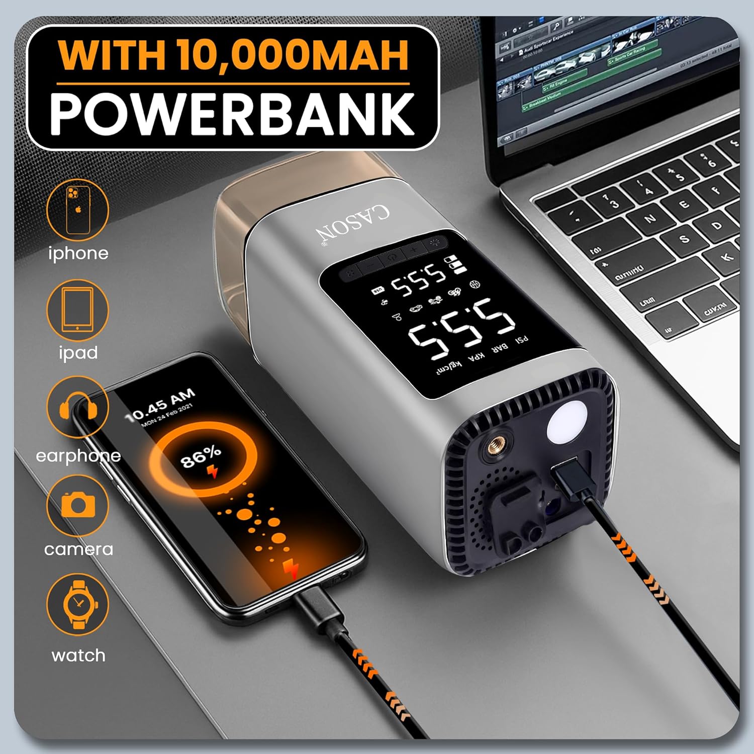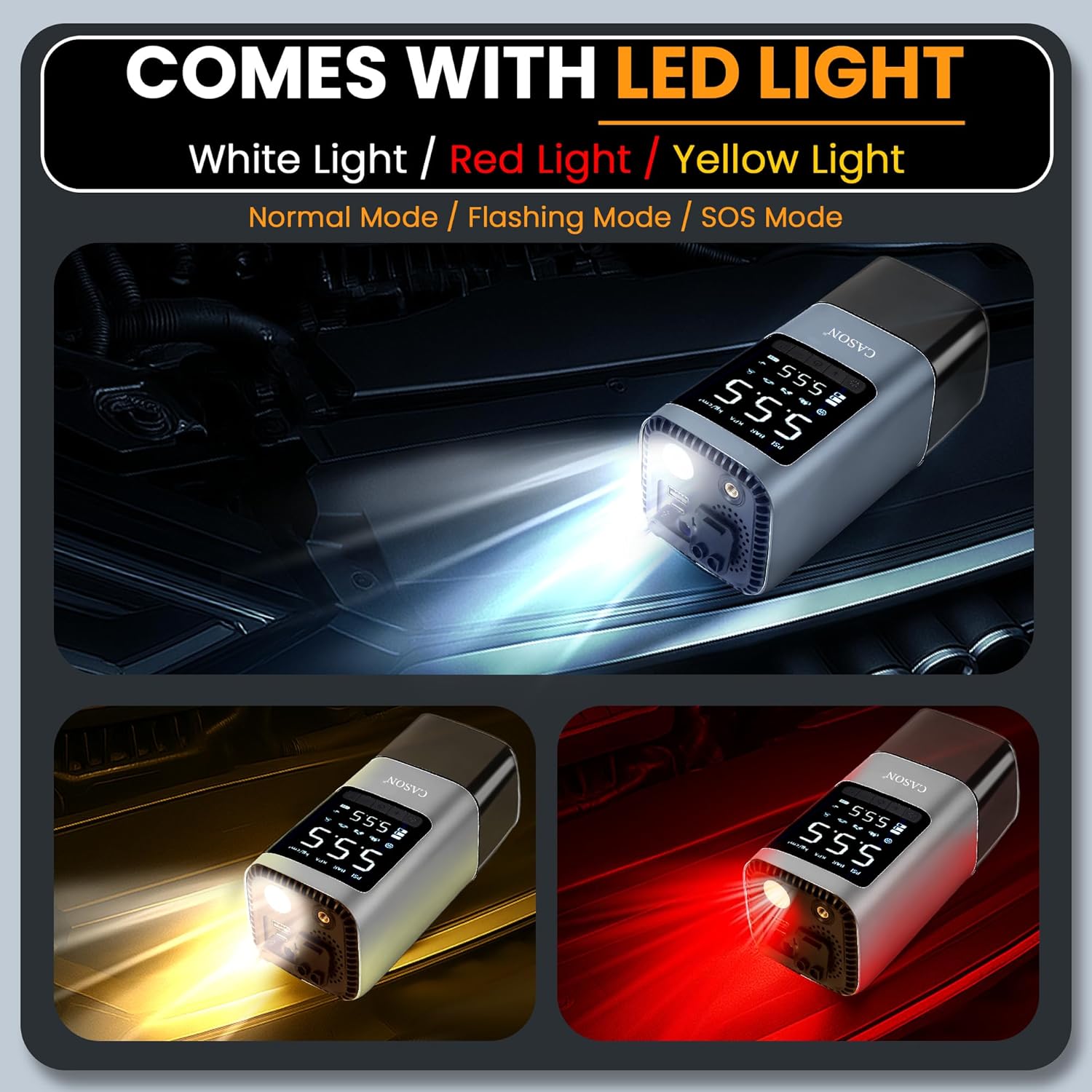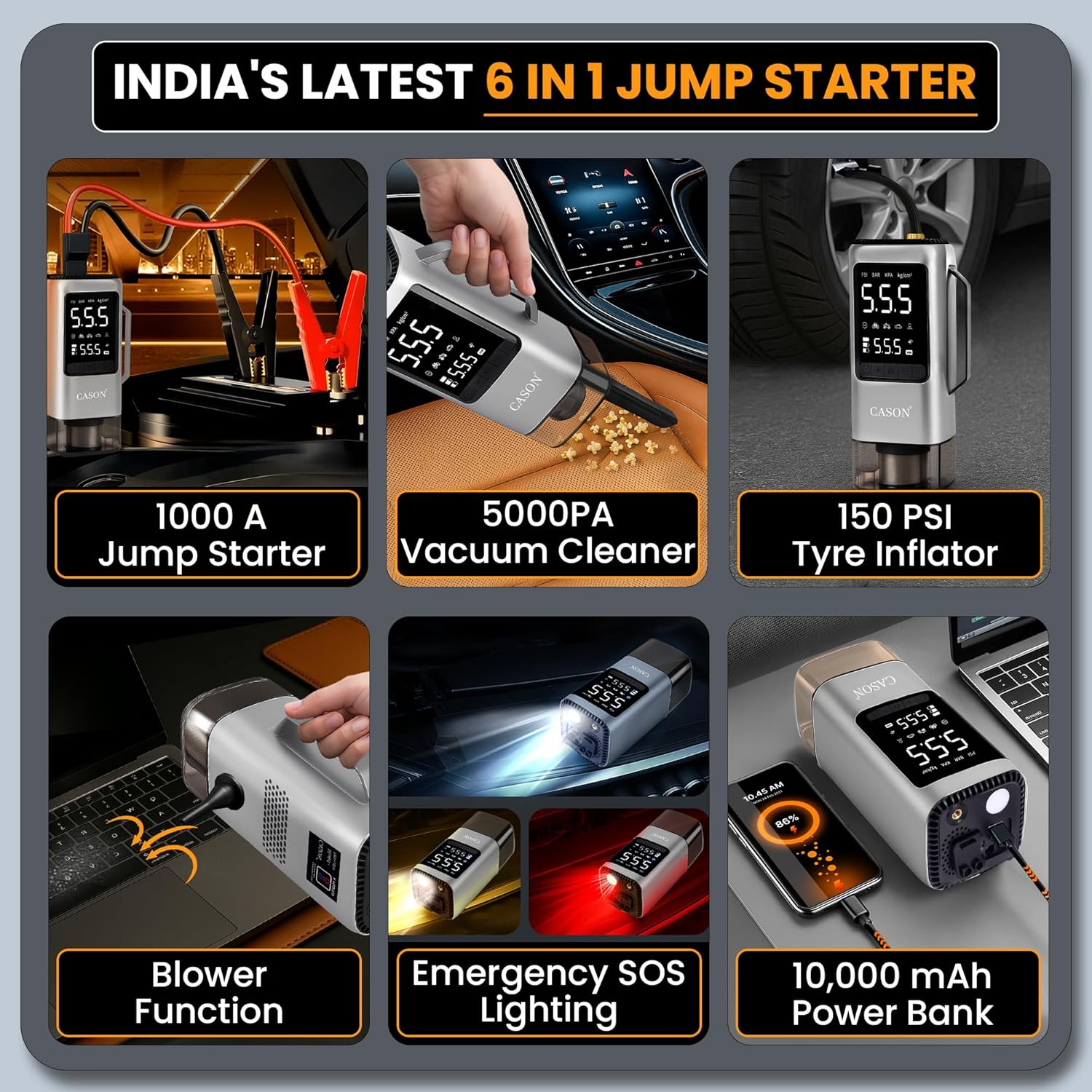 CASON 6 in 1 Tyre Inflator for Car,Bike with Car Battery Jump Starter,Vaccum Cleaner & Power Bank,3X Faster Inflation Air Inflator Pump(10,000 mAH)(Grey), 23 Liters Per Minute