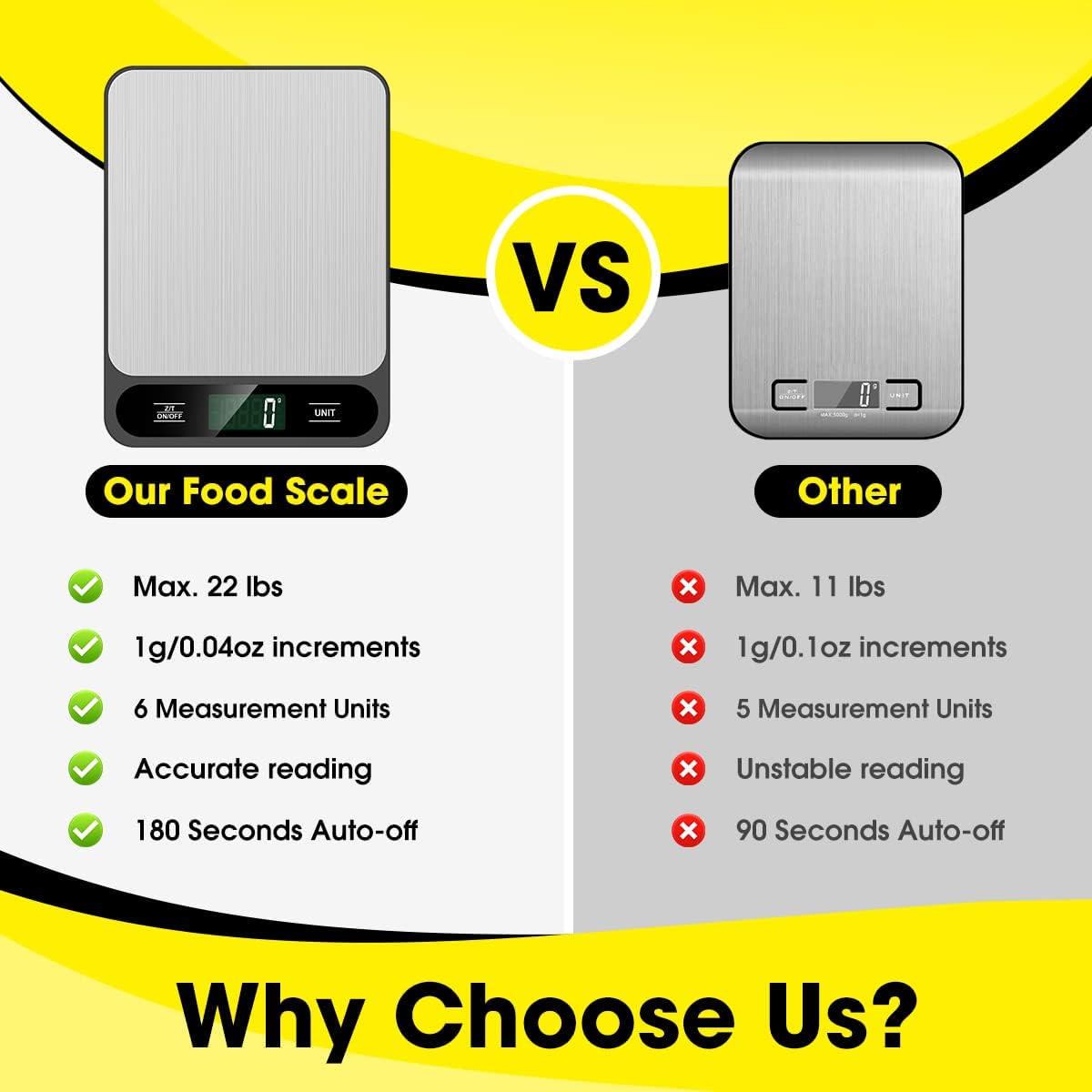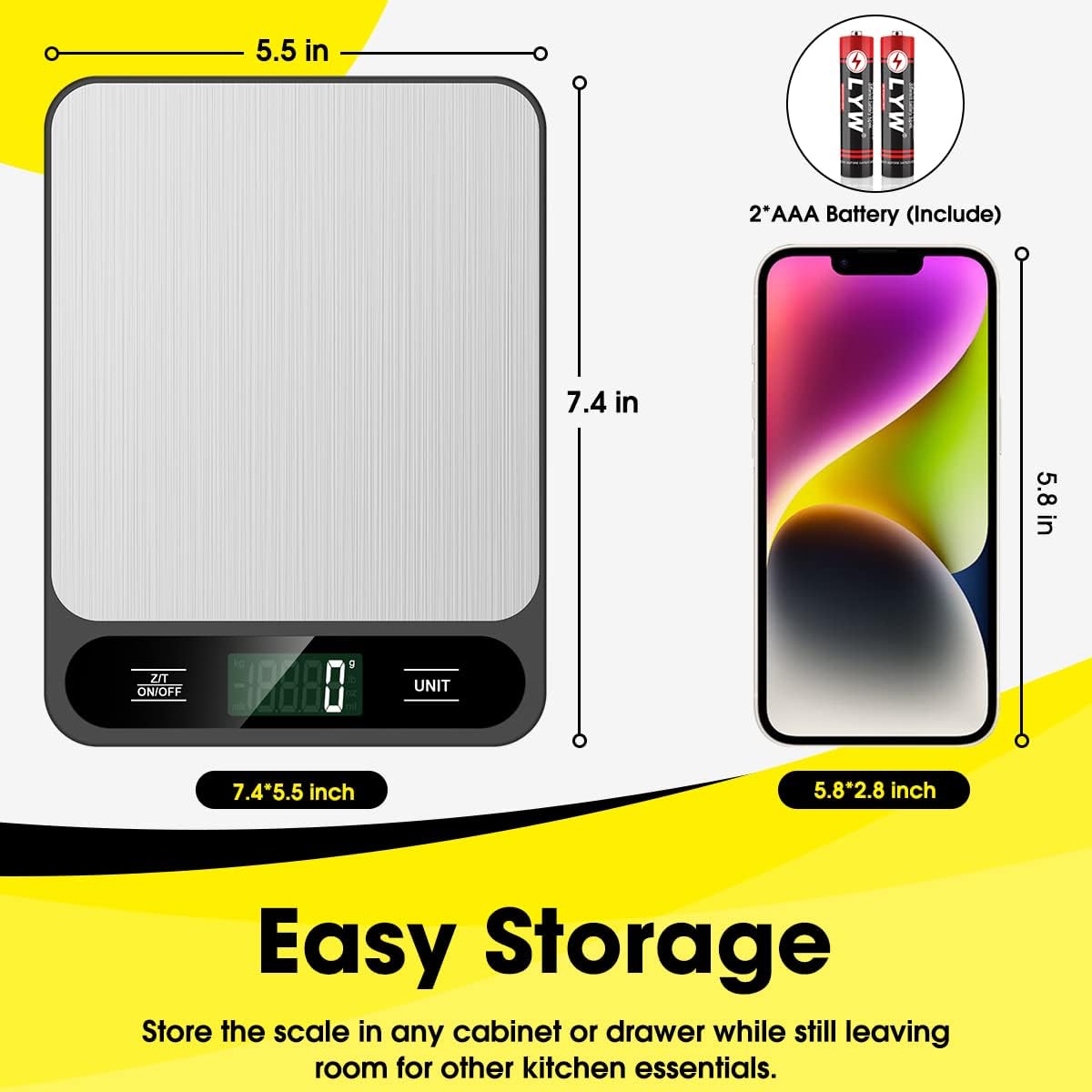 - Energy Saving Kitchen Scale-This energy-saving Weigh Scale for Food scales come with 2 AAA batteries (included) to extend the standby time, ensuring long-lasting use. With a simple push-button operation, you can easily turn on the Weight Machine Food and long press for 3 seconds to turn it off, making it convenient and efficient for all your food measuring needs.