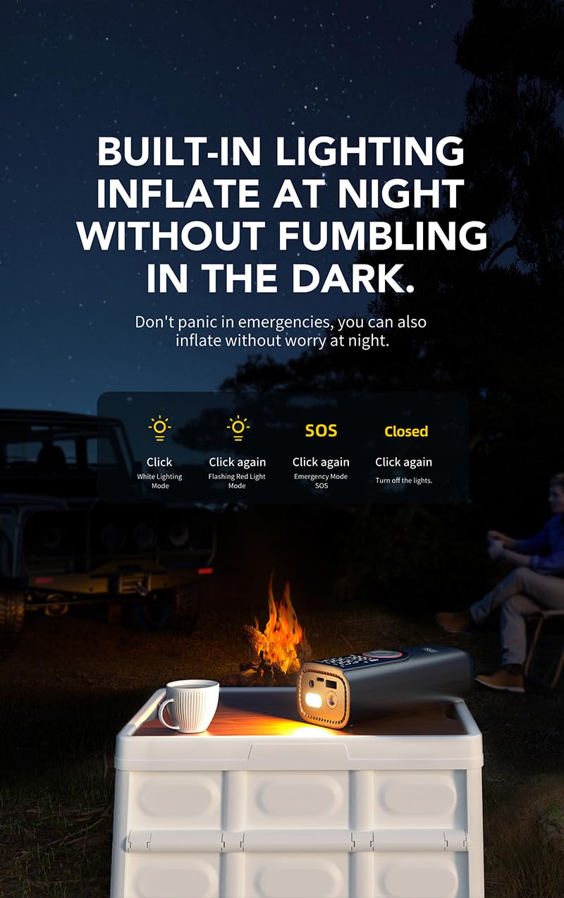- 4 Inflation Modes-The portable car air pump for tyres features 4 units: PSI, KPA, BAR, and KG/CM², along with 4 preset inflation modes (car, motorbike, bicycle, ball). Once the preset pressure is reached, the air inflator for car will automatically shut off, preventing over-inflation. This versatile tyre inflator for bike ensures precision and safety for all your inflating needs.